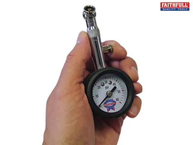 The Faithfull Tyre Pressure Dial Gauge is an easy-to-use, manual tyre pressure gauge for use with Schrader valves as fitted to all automotive tyres, it provides an instant reading of tyre pressure up to a maximum of 60 psi. The gauge features a 45° angled chuck for easy connection to the tyre, and will retain the current reading when removed from the valve.