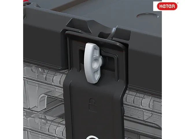 Removable dividers let you customise your space to fit different sized items. A polycarbonate locking strip keeps drawers secured in the storage frame at all times. Fitted with a fold-down carry handle for easy portability.