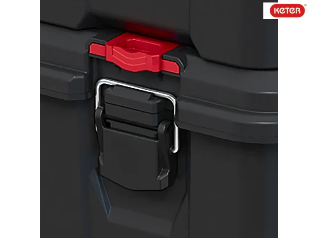 The Keter Stack N Roll Cart comes with ergonomic one-click release button handle and side grips for secondary lifting option. Its durable 7in wheels provide stable transportation. Heavy-duty metal latches allow you to securely fasten the lid with audible closing indication.