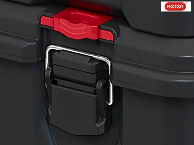 1 x Stack N Roll Cart with ergonomic one-click release button handle and side grips for secondary lifting option. Its durable 7in wheels provide stable transportation. Heavy-duty metal latches allow you to securely fasten the lid with audible closing indication. Provides the rolling base of the Keter Stack & Roll System.