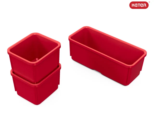 The Keter Stack N Roll Organiser has a transparent polycarbonate lid and removeable storage bins in various sizes. Heavy-duty metal latches allow you to securely fasten the lid with audible closing indication. The IP54 seal protects contents from dust, moisture and accidental contact with water, and is ideal for outdoor use. Fitted with a comfortable soft rubber carry handle.