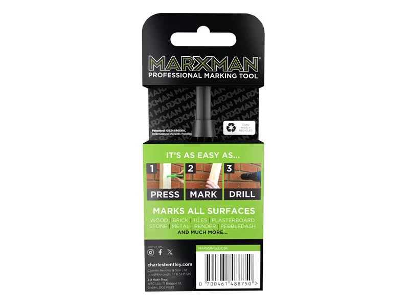 Developed with tradespeople in mind, the Marxman tool delivers a burst of removable green pigment that clearly marks surfaces through holes or fixing points. Ideal for use with brackets, shelves, and electrical boxes, it simplifies marking tasks where pencils or pens can’t reach.
