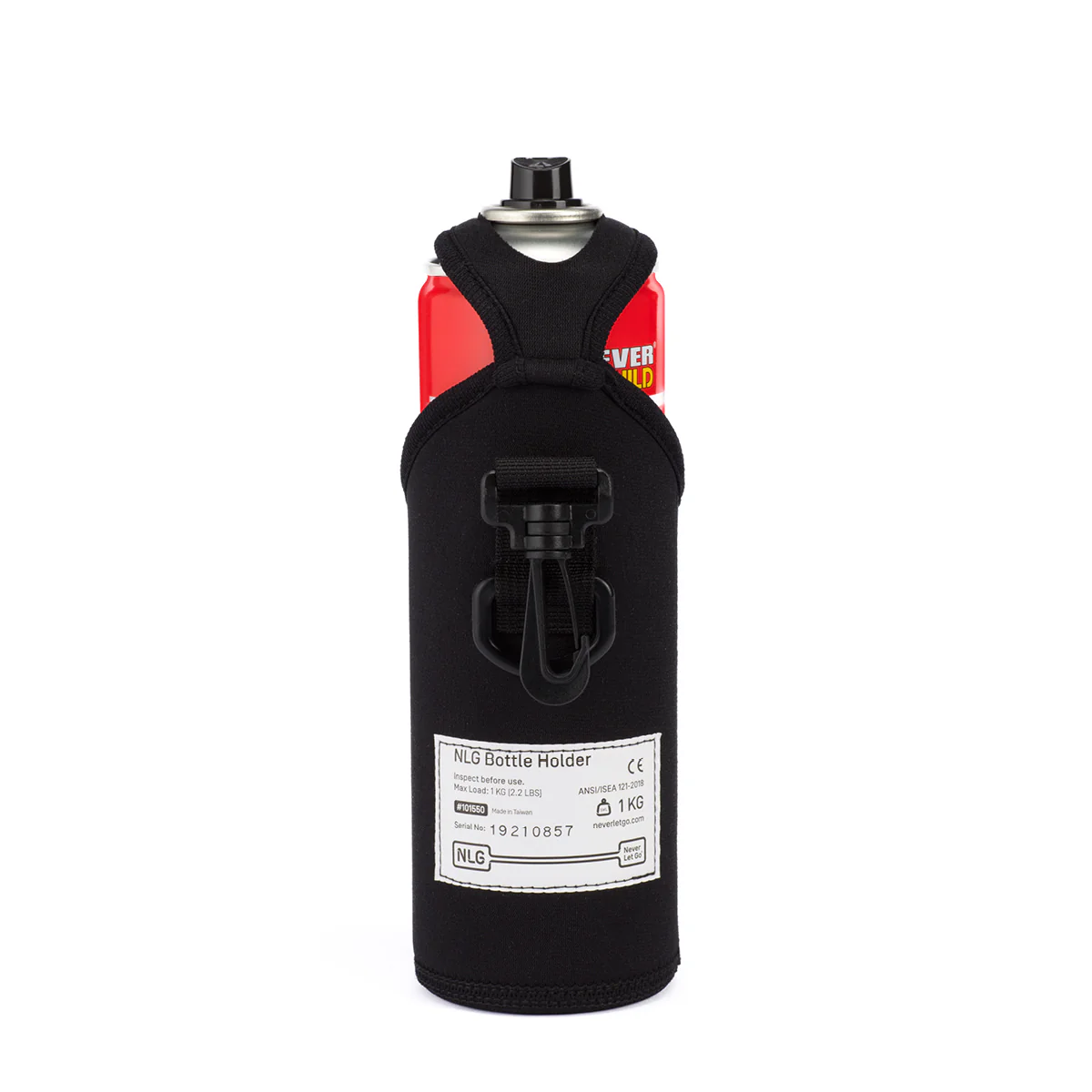 The NLG Bottle Holster is a quick simple way to secure any bottle or can when working at height. Engineered from abrasion resistant neoprene, with ballistic nylon clips and D Ring this holder is designed for hard use. The holder will work with any standard spray can or aerosol, and water bottles up to 500ml. The holder features and additional clip on the rear - this allows the user to clip the holder directly onto their belt or harness - and the D Ring is used for the lanyard - this means that the bottle is 100% tied off when working at height, and even when clipping back onto the belt or harness there is no chance of an accidental release. Internal diameter of 70mm and a height adjustable strap allows this holder to work for cans/bottles from 16cm-21cm (6"-8") tall.